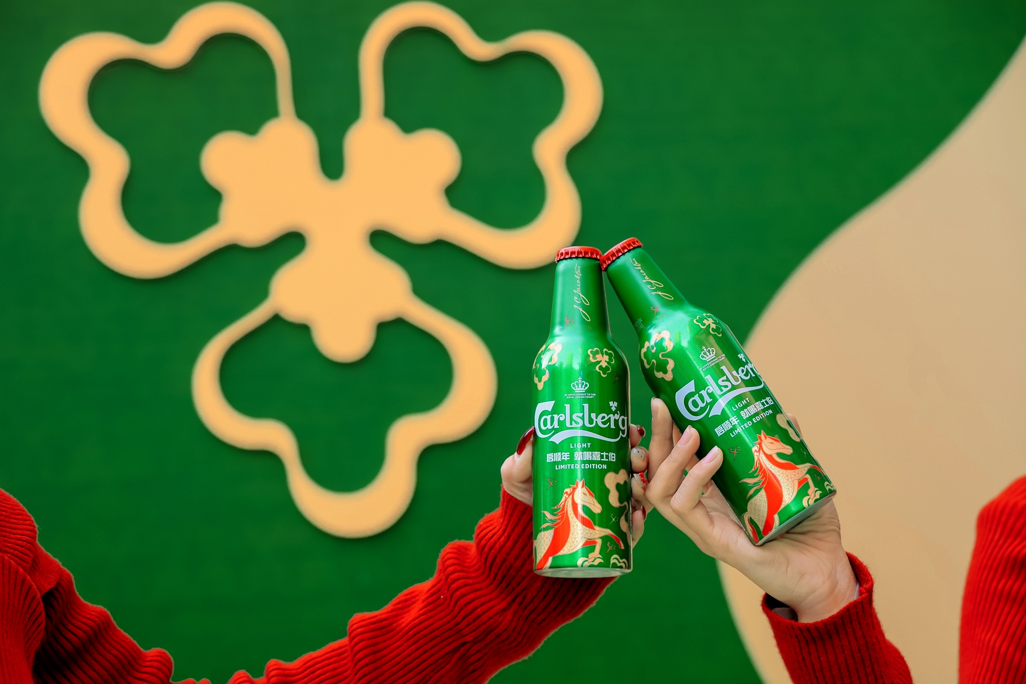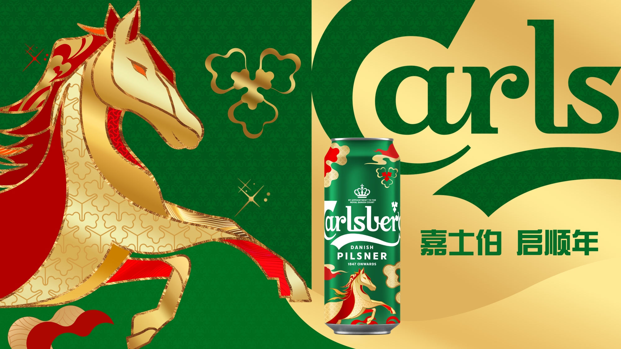 The Year of the Horse is a powerful symbol of energy, freedom, bravery and good fortune, and these themes have been creatively woven into the design. The motif of the Horse can be seen riding high above the sky, below Carlsberg's Hop Leaf seen transformed into the shape of lucky clouds. Set on a dark green background with red and gold accents, the latter are associated with happiness and wealth for the year ahead.
